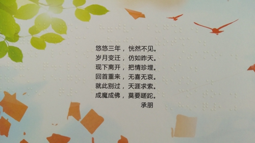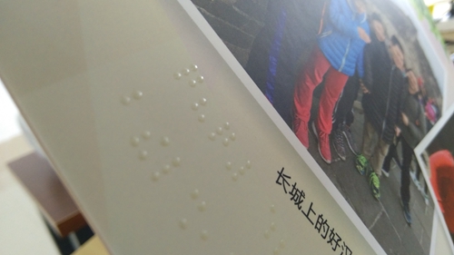 一個(gè)架子上,放著一疊厚實(shí)的精裝冊(cè)子,封面寫著“2018屆貳家紀(jì)念冊(cè)”。翻開冊(cè)子,與以往見到的一樣,紙面印著一張張燦爛而純真的笑臉和一些文字,不一樣的是,紙面上還多了一些微微凸起圓點(diǎn),大約厚度1mm左右,按一種特有的規(guī)律排列,看起來晶瑩剔透,用手撫摸一下,顆粒感很真實(shí),這就是“盲文畢業(yè)紀(jì)念冊(cè)”。